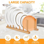 The rack features 8 upright slots that securely hold plates, cutting boards, pot lids, baking trays, and serving platters. Its evenly spaced design prevents scratches and ensures good air circulation, making it perfect for both storage and drying. A smooth, moisture-resistant finish protects the bamboo from water damage and stains, allowing safe use even in wet environments.
