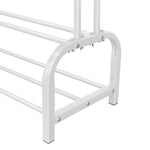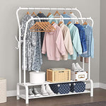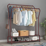 Lukzer Multipurpose Curved Metal New Double Garment Rack (Black) maximizes storage space with its heavy-duty double-pole design, two bottom shelves, and a convenient side hook. Ideal for bedroom or living room organization, this sturdy metal rack offers ample hanging and storage capacity for clothes, shoes, and accessories. Easy assembly ensures quick setup, making it a practical and stylish solution for home storage needs.