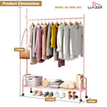 Upgrade your clothing storage with Luzker Metal Garment Stand, designed for durability, functionality, and modern aesthetics. Built from strong, rust-resistant metal, this garment stand provides reliable support for daily wear, seasonal outfits, coats, dresses, and accessories. The sturdy hanging rod is available in 90 cm and 110 cm width options, making it suitable for compact rooms as well as larger spaces. Equipped with lockable wheels, the stand offers smooth mobility when needed and firm stability when locked, ensuring safe and convenient use on all floor types. It comes with multiple storage configurations, including single and double basket mesh organizers for breathable storage of clothes, towels, or accessories, as well as normal single and double storage organizers for shoes, boxes, and folded garments. Available in a wide range of stylish colors β Black, Deep Sea, Gold, Olive Yellow, Grey, Pink, and White β this garment stand complements modern homes, bedrooms, boutiques, showrooms, and laundry areas. Easy to assemble and space-efficient, it is an ideal solution for organized, clutter-free living with a premium look and long-lasting performance.
