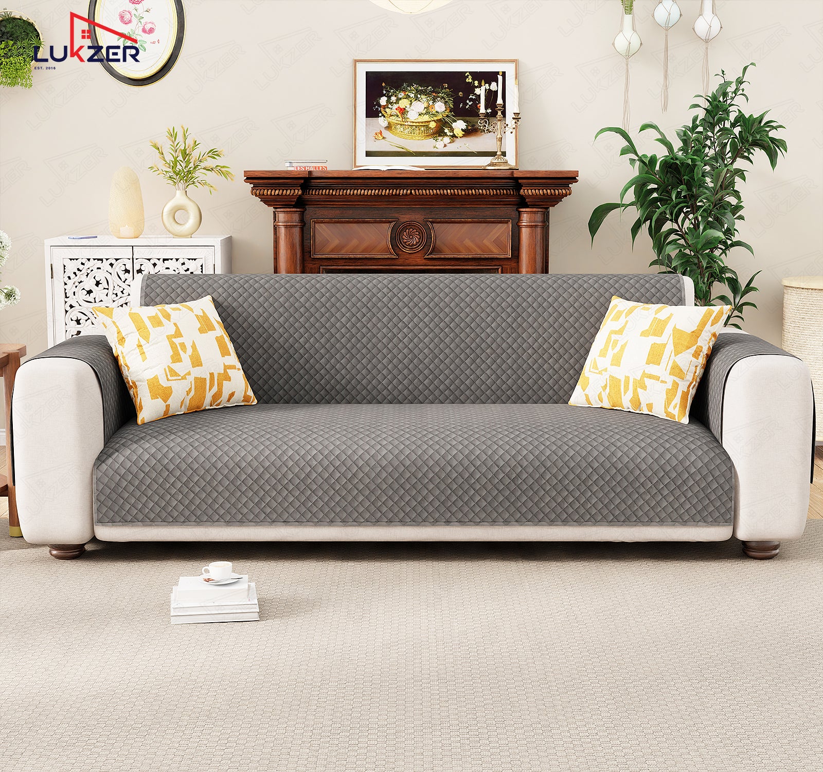 Lukzer Quilted Velvet Sofa Mat | 200 GSM Soft Washable & Removable Couch Protector | Anti-Slip Elastic Strap Cover for Living Room, Pet & Spill Protection
