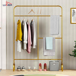 - Lukzer MGS-005 Gold Metal Garment Stand with Bottom Shelf | Heavy-Duty Clothes Rack